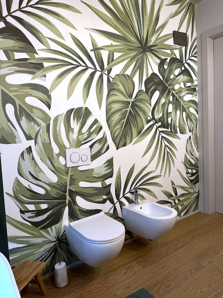 Il soggetto delle imponenti foglie di monstera della carta da parati completa lo stile deciso di questo ambiente. Ogni dettaglio è curato con attenzione per creare uno spazio unico e accogliente. Gli accessori e gli arredi seguono la palette di colori, completando l’armonia del design.